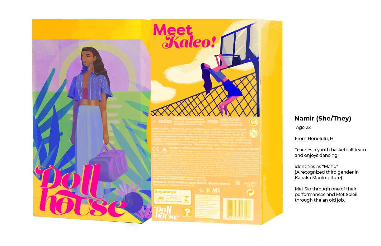 When creating the form of the box, I wanted to implement fluidity as it relates to gender. I also wanted detract from the conventional open front-facing box typically used for doll packaging. I also wanted to craft designs that also recognized the importance of sharing the backstory/background of the dolls. Furthermore, I decided to have an open face on the side of the packaging as well.